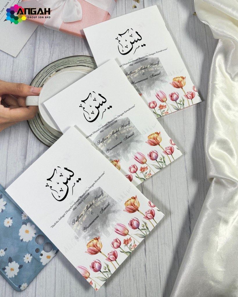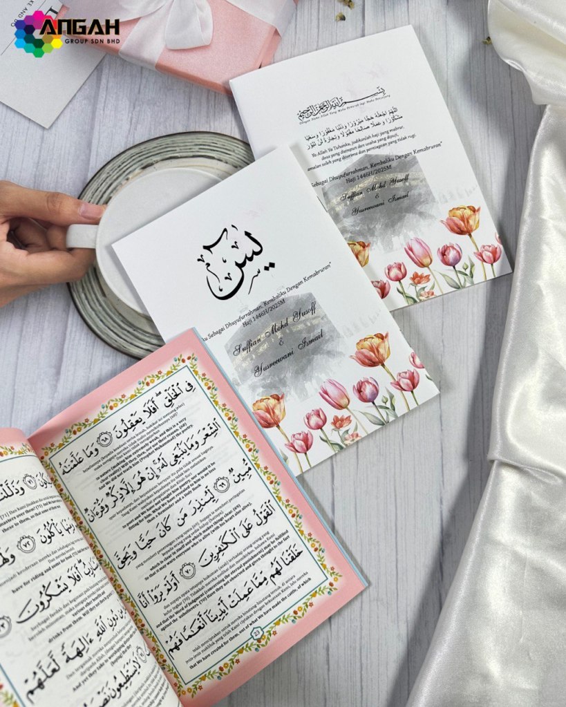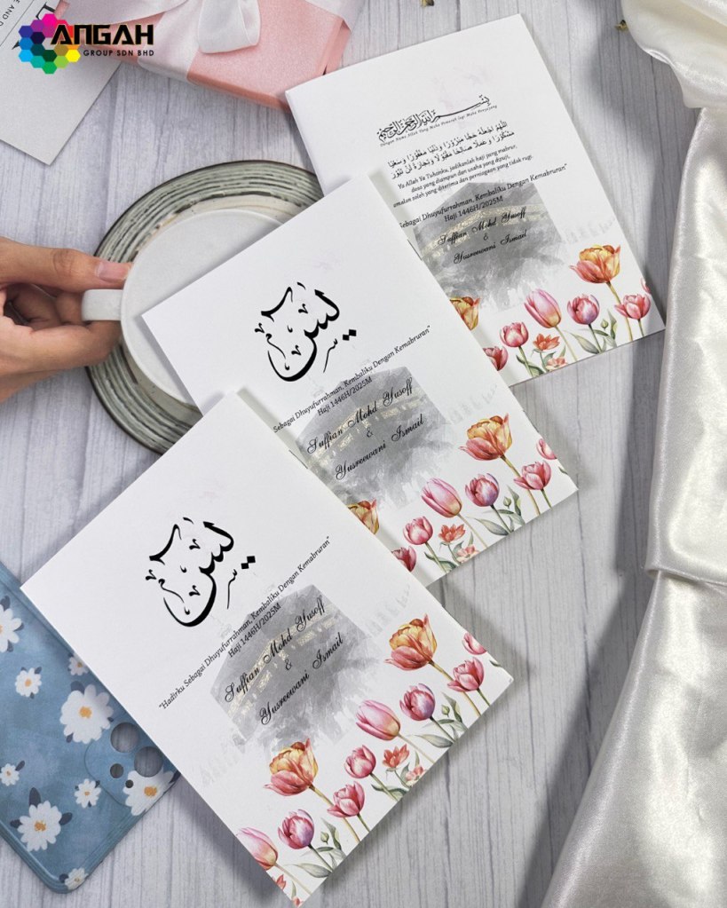 Buku Yasin ini boleh dicetak dengan nama, tarikh, dan doa khas. Ia bukan sekadar bacaan, tapi lambang kasih dan doa untuk perjalanan yang diberkati.