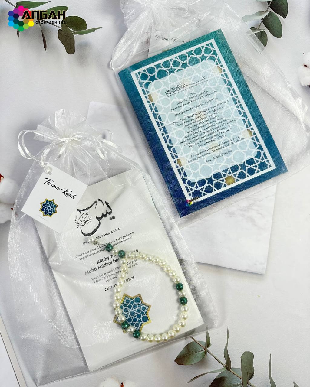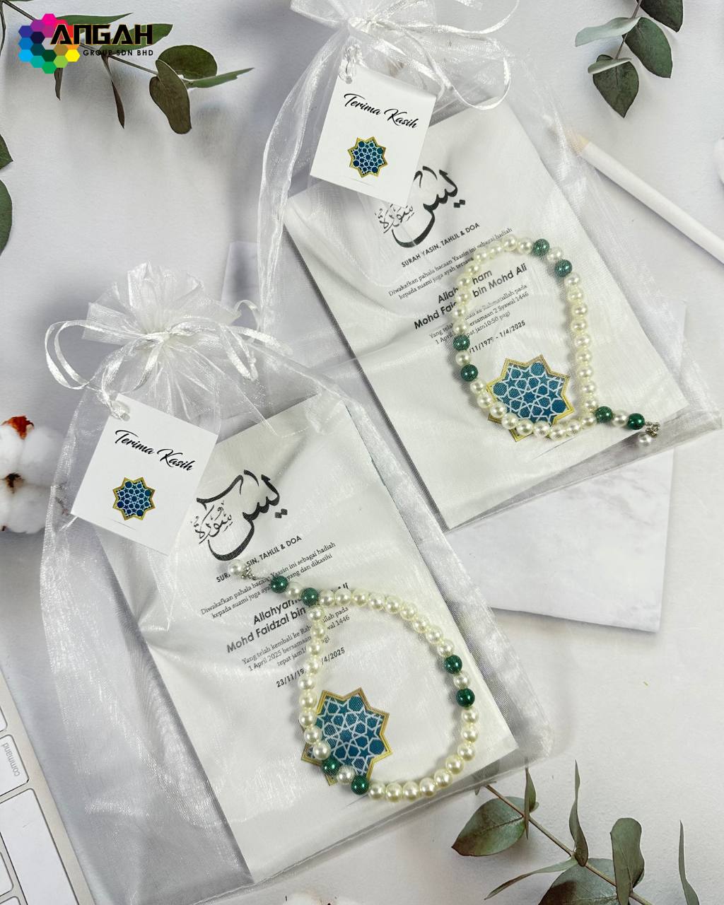 Buku Yasin + Tasbih Set Organza ini direka eksklusif dengan cetakan jelas dan tasbih yang berwarna, sesuai dijadikan doorgift bermakna.