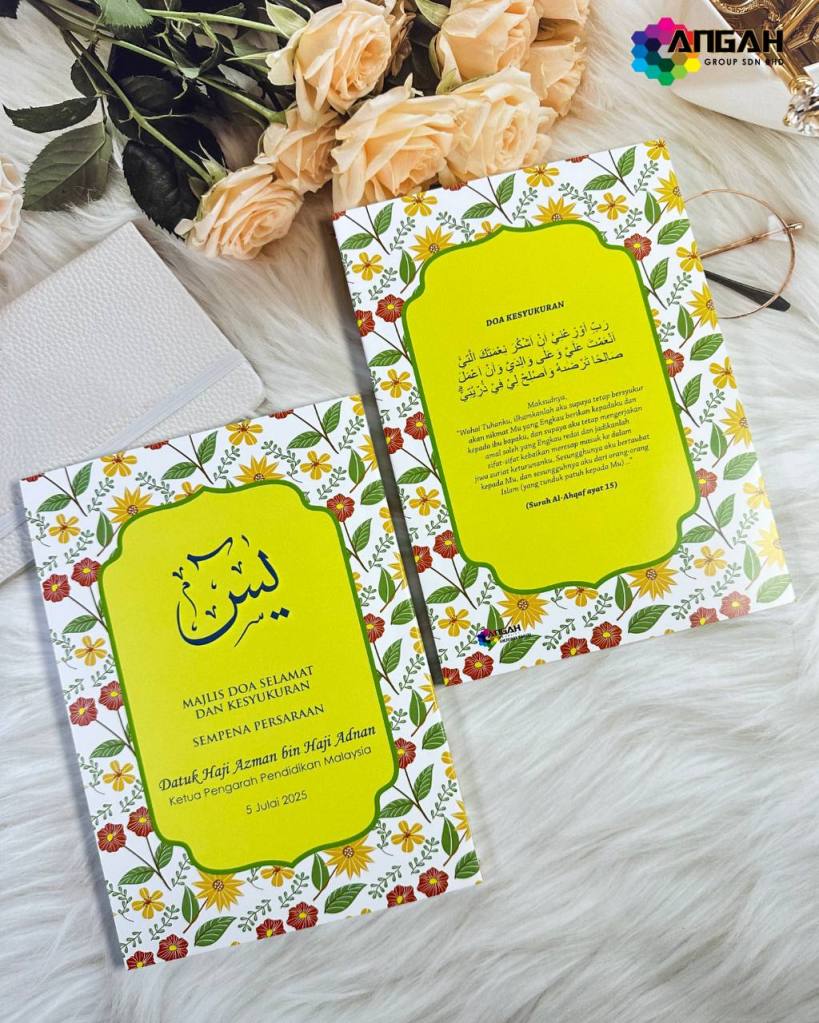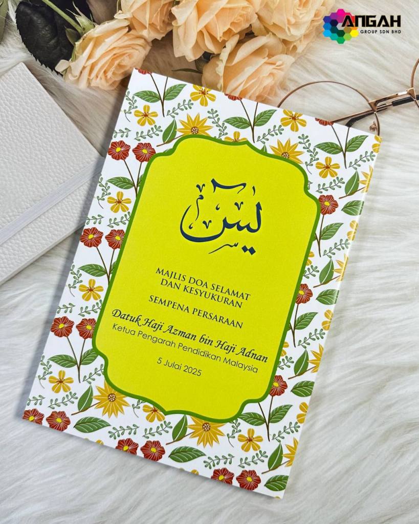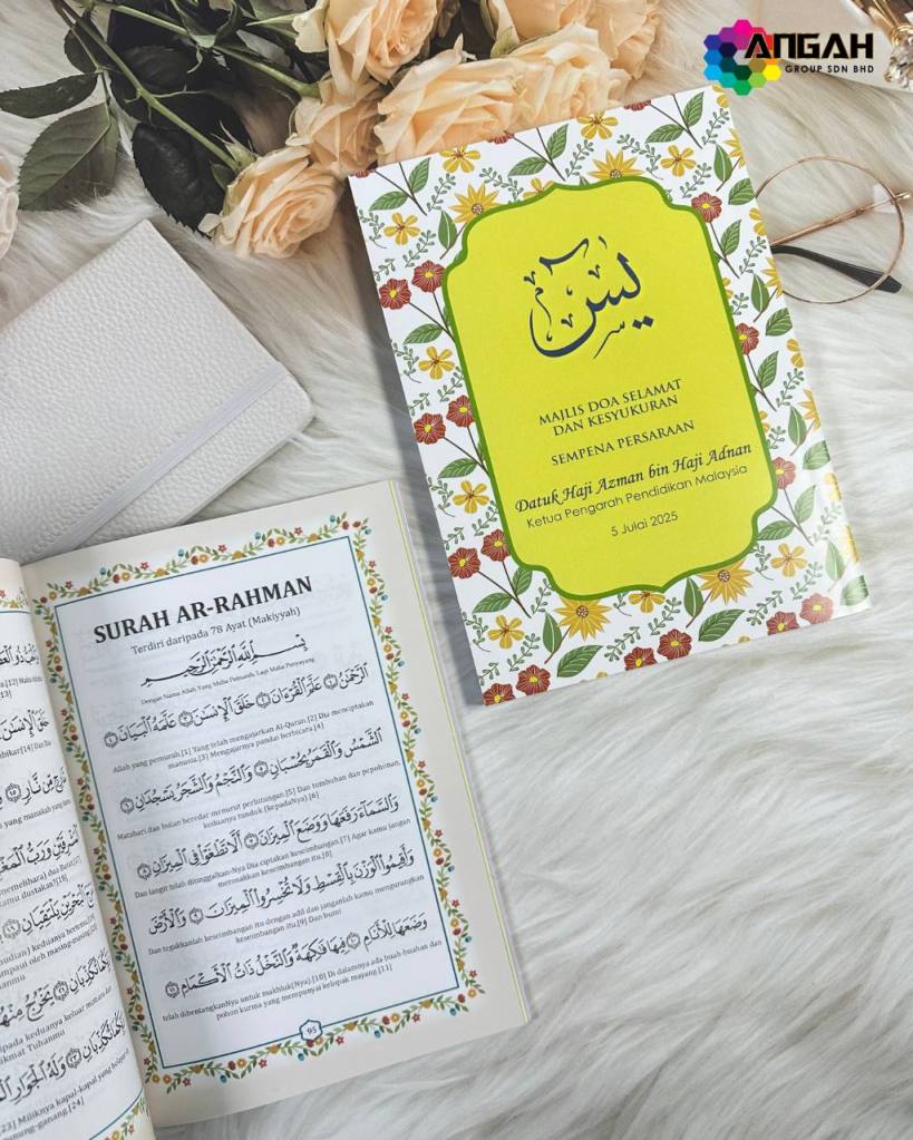 Set Buku Yasin dalam kotak eksklusif, siap ikat riben. Ikatan kemas, cantik dan penuh makna. Sesuai untuk majlis tahlil, kenduri atau hadiah kenangan.