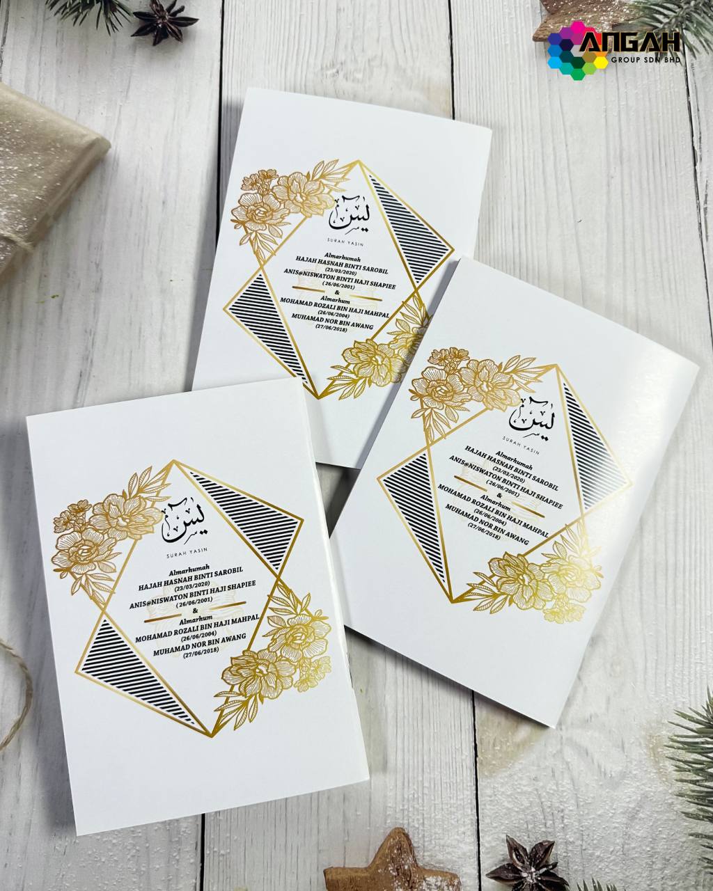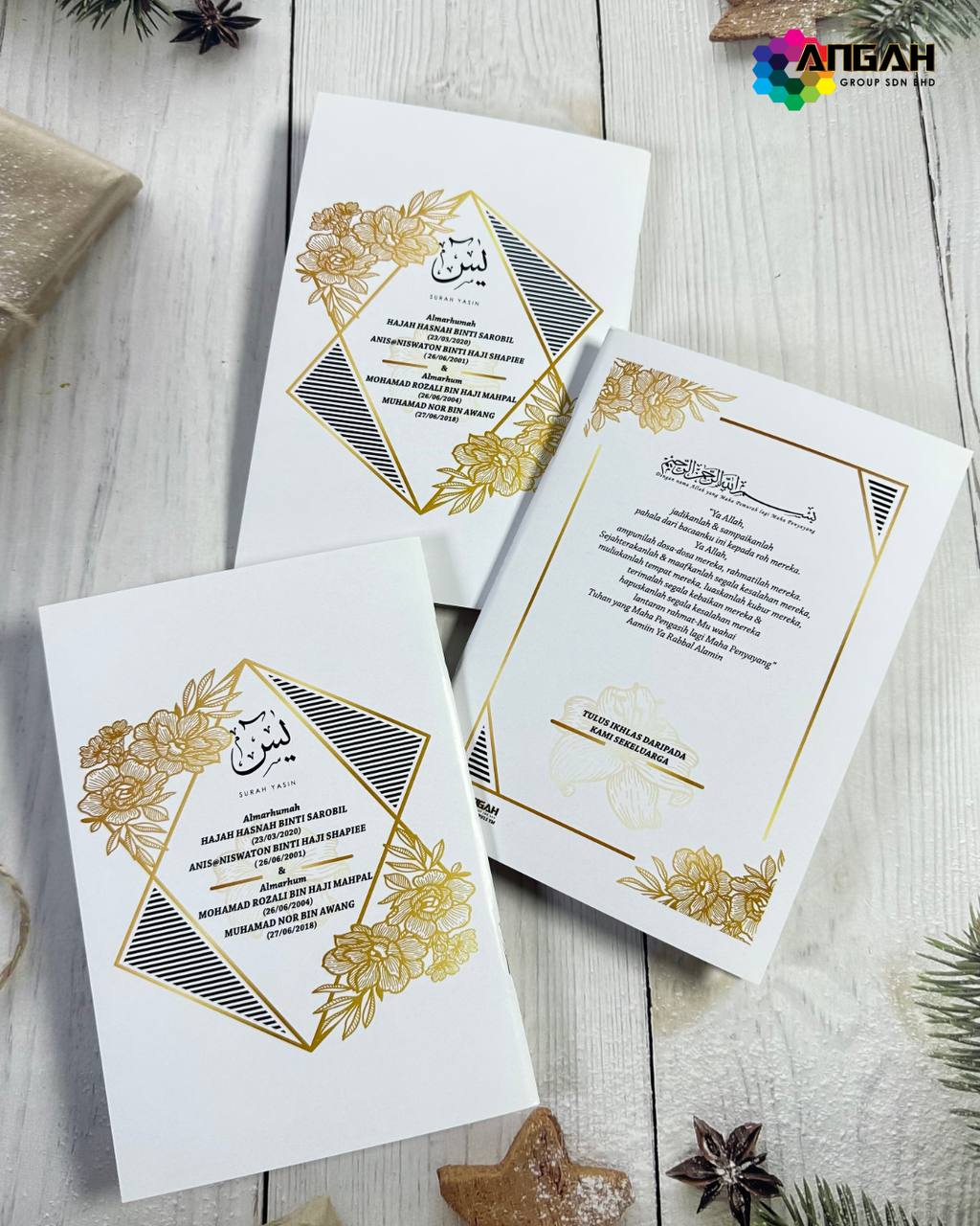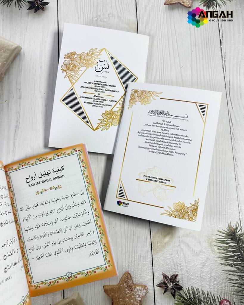 Kami sediakan buku Yasin custom yang boleh letak nama arwah, tarikh dan ucapan khas.